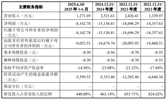 2022年至2024年及2025年上半年,禾元生物营业收入分别为1,339.97万元、2,426.41万元、2,521.61万元、1,271.05万元,净利润/归属于母公司所有者的净利润分别为-14,357.63万元、-18,696.29万元、-15,136.81万元、-8,162.78万元,扣除非经常性损益后归属于母公司所有者的净利润分别为-14,860.51万元、-20,093.95万元、-16,674.74万元、-9,053.53万元,经营活动产生的现金流量净额分别为-6,640.34万元、-12,285.48万元、-5,353.40万元、-5,599.53万元。